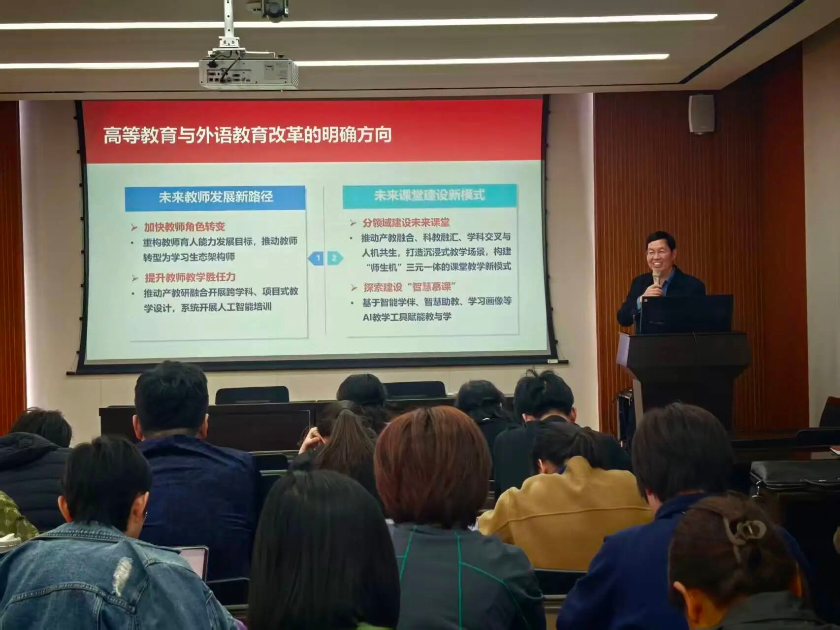 随后,杨剑波传达了学校年度工作会议精神和学校综合改革实施方案暨两年行动计划的主要内容,并结合21点基本策略 实际进行了解读。他指出,大学外语教学要聚焦“学科融合、数智赋能、面向国际”的发展新思路,围绕大学英语课程体系改革、拔尖创新人才培养、教师队伍能力提升以及社会服务与资源拓展等重点任务,做好年度工作。